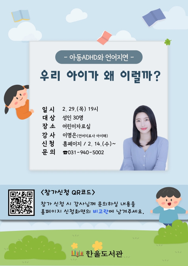 파주 한울도서관은 오는 29일 ‘아동 에이디에이치디(ADHD)와 언어지연’에 대한 강좌를 운영한다.