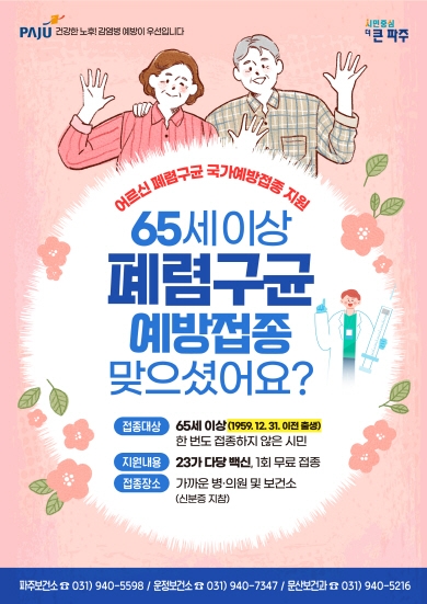 파주시, 65세 이상 어르신 폐렴구균 무료 예방접종
