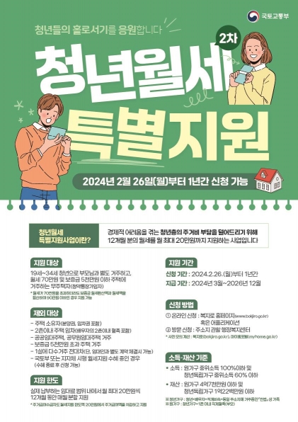 지원 대상은 부모와 따로 거주하고, 임차보증금 5,000만 원 및 월세 70만 원 이하의 주택에 거주하는 만 19세~34세 이하(2024년 기준 1989년~2005년생) 무주택 청년이다. 월세액 70만 원이 넘더라도 보증금의 월세 환산액(연 5.5%)과 월세를 더한 금액이 90만 원 이하면 지원 대상이다. 5,000만 원 및 월세 70만 원 이하