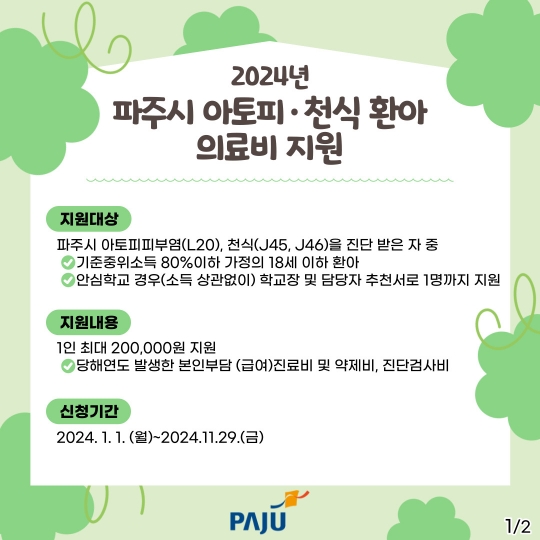 취약계층 아토피·천식 환아 의료비 지원사업은 1인당 년 최대 20만 원까지 지원하며, 지원 대상은 파주시 거주 중위소득 80% 이하 가정의 18세 이하 아토피피부염(질병코드: L20)과 천식(질병코드: J45, J46) 진단 질환자다.