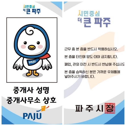 파주시는 투명한 부동산 거래질서 확립을 위해 공인중개사협회 파주시지회를 통해 관내 등록된 모든 공인중개사에게 명찰을 패용하도록 요청했다고 밝혔다.