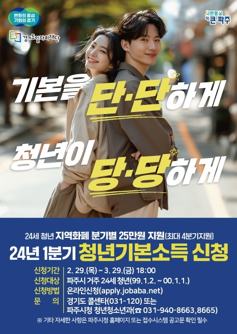 파주시는 2월 29일부터 3월 29일까지 청년의 사회참여 촉진 및 사회적 기본권 보장을 위한 ‘2024년 1분기 청년기본소득’ 신청을 받는다.