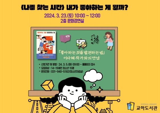 파주시 교하도서관은 오는 23일 청소년 대상 독서프로그램인 ‘나를 찾는 시간-내가 좋아하는 게 뭘까?’를 운영한다.