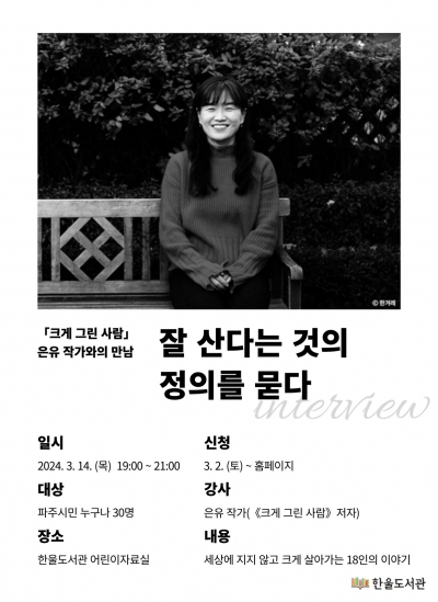 파주 한울도서관은 오는 14일 『크게 그린 사람』의 저자 은유 작가를 초청해 작가와의 만남(부제: 잘산다는 것의 정의를 묻다)을 실시한다.