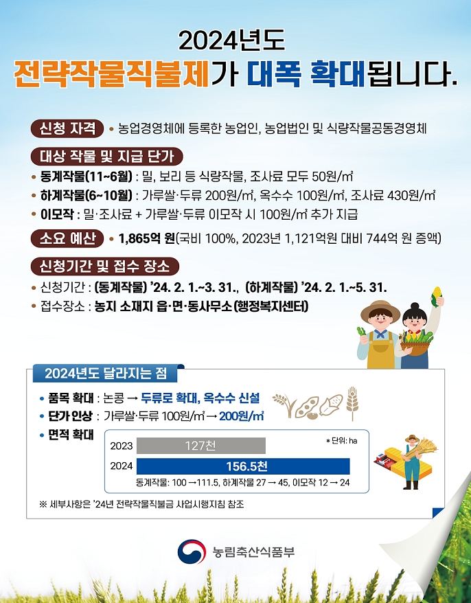 올해 전략작물직불금 지급 대상은 논콩뿐만 아니라 옥수수도 포함된다. 하계 조사료 대상 농지도 2023년 전략작물직불금(조사료)을 받은 농지, 2023년 벼를 재배한 농지, 쌀 생산조정에 참여해 조사료 재배로 전환한 농지 등으로 확대됐다.