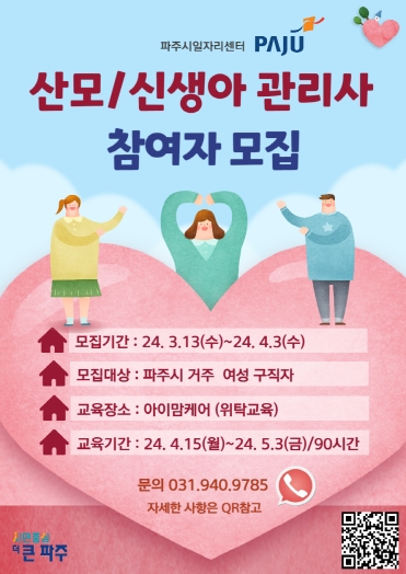 파주시가 여성 특화 취업지원 프로그램으로 산모의 산후 회복과 신생아 양육을 돕는 ‘산모·신생아 관리사 과정’ 교육생 20명을 3월 13일부터 4월 3일까지 모집한다.