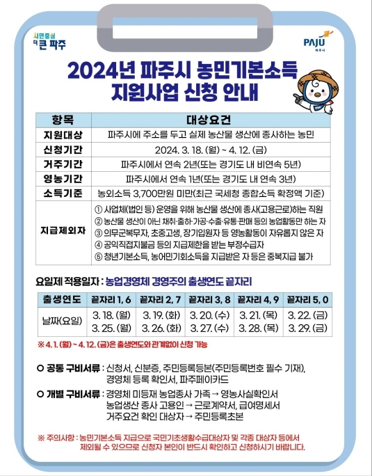 파주시는 3월 18일부터 4월 12일까지 ‘2024년 농민기본소득 지원사업’ 참여 신청을 받는다.