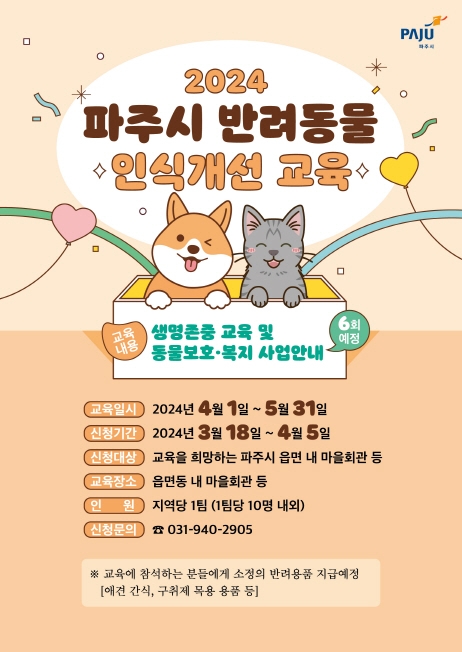 파주시는 3월 18일부터 4월 5일까지 ‘반려동물 인식개선 교육’ 참여자를 10명 내외로 모집한다.