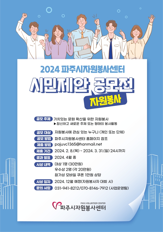 (사)파주시자원봉사센터는 3월 31일까지 시민들을 대상으로 참신하고 새로운 주제 또는 형태의 자원봉사 아이디어 공모전 ‘2024 파주시자원봉사센터 시민제안 자원봉사 공모전’을 진행한다.