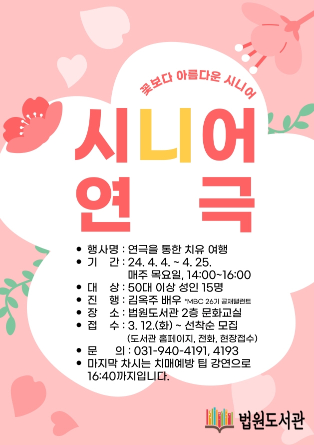 파주시 법원도서관은 4월 4일부터 25일까지 매주 목요일 장년층을 대상으로 ‘연극을 통한 치유여행’을 진행한다.