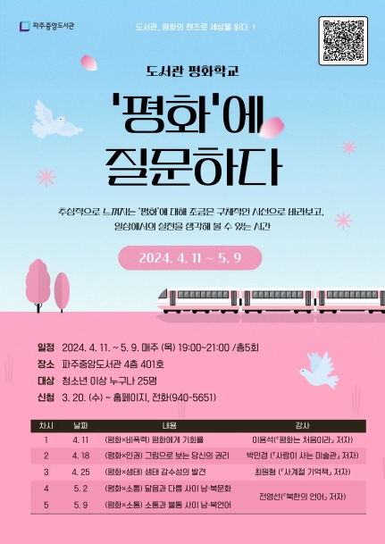 파주중앙도서관은 4월부터 ‘도서관, 평화의 렌즈로 세상을 읽다’라는 주제로 ‘도서관 평화학교’를 운영한다. 점차 잊혀가는 전쟁과 분단에 대한 시민들의 관심을 높이고 더 나아가 평화와 공존에 대한 가치와 이해를 높이기 위한 기획사업의 일환이다.