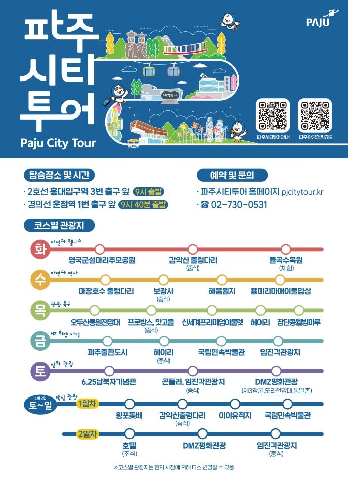 탑승지는 홍대입구역(3번 출구, 9시) 또는 운정역(1번 출구, 9시 40분)으로, 예약 등 관련 문의는 파주시티투어 누리집(www.pjcitytour.kr)을 확인하거나 파주시티투어 고객센터(☎02-730-0531)로 문의하면 된다.