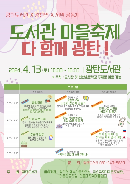 파주시 광탄도서관은 4월 13일 ‘다 함께 광탄’이라는 주제로 「도서관 마을 축제」를 개최한다.