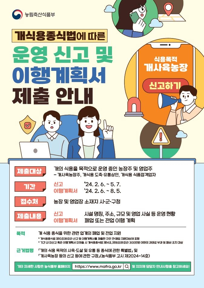 이번 서류 제출은 ‘개의 식용 목적의 사육‧도살 및 유통 등 종식에 관한 특별법(약칭 개식용 종식법)’이 2월 6일 공포에 따른 것이다.