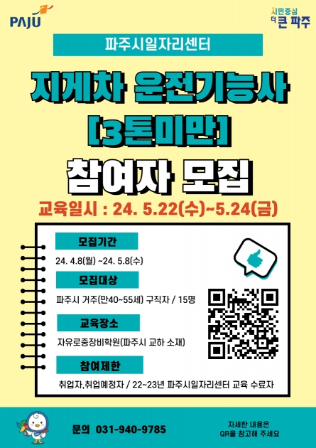 파주시가 4월 8일부터 5월 8일까지 ‘지게차(3톤 미만) 운전기능사 과정’ 교육생 15명을 모집한다.