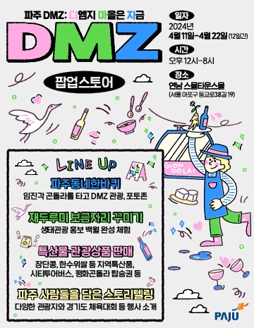 파주시는 4월 11일부터 22일까지 서울 연남동에서 디엠제트(DMZ)를 주제로 한 ‘파주관광 번개장터(팝업스토어)’를 개최한다.