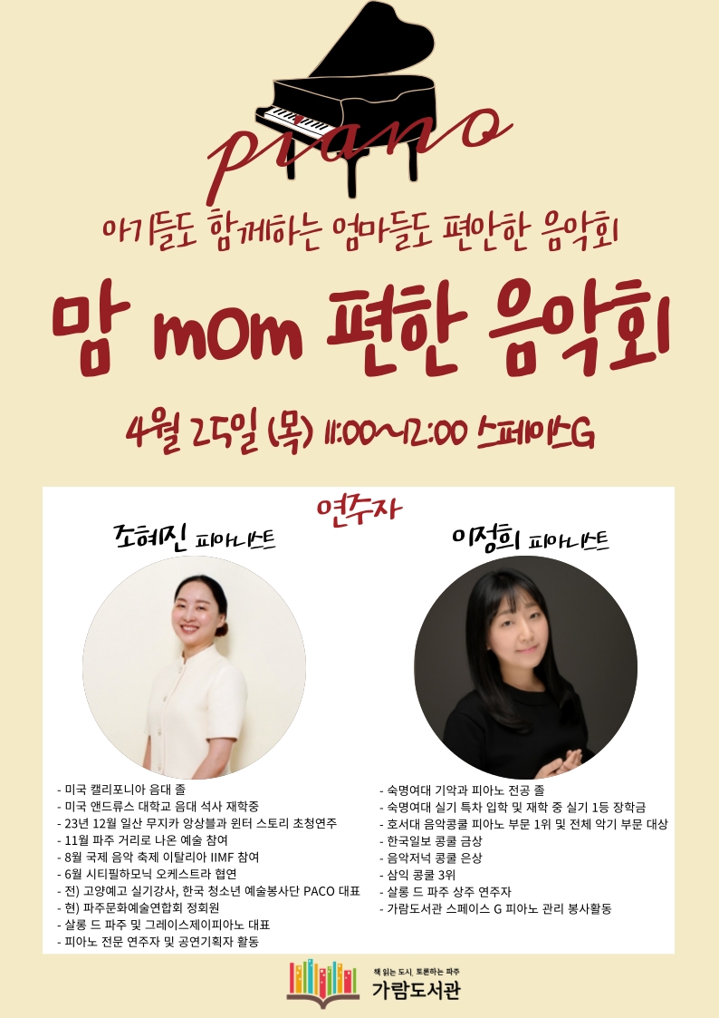 파주시 가람도서관, 4월 25일 '맘(mom) 편한 음악회' 운영
