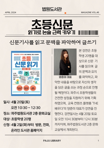 파주시 법원도서관은 오는 20일 법원도서관 2층 문화교실에서 양춘미 작가(초등 신문 읽기 저자)를 초청해 ‘초등 신문 읽기로 논술 근력 키우기’라는 주제로 강연을 개최한다.