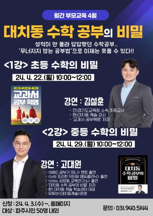 4월 22일과 29일에는 ‘대치동 수학 공부의 비밀’이라는 주제로 부모교육 강연이 2차에 걸쳐 운영된다. 이번 부모교육 강연은 ‘교과서 공부혁명’과 ‘대치동 수학 공부의 비밀’을 각각 집필한 김설훈, 고대원 강사를 초청하여 자녀의 수학 성적이 잘 오르지 않아 고민이 많은 학부모들을 위해 수학이 재미있어야 공부를 잘 하는게 아닌, 공부를 잘해야 수학이 재미있어지는 자녀의 수학 공부법에 관해 학부모들과 소통하는 시간을 갖는다.