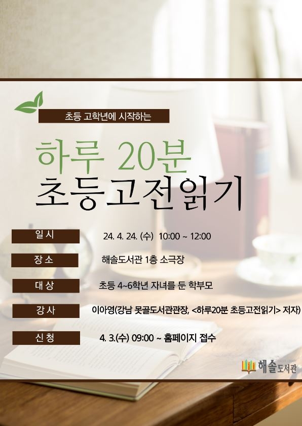 4월 24일은 <하루 20분, 초등 고전 읽기>의 저자이자, 강남 못골도서관을 이끌고 있는 이아영 관장 초청 강연이 열리며, 초등 고학년 자녀를 둔 학부모를 대상으로 진행된다.
