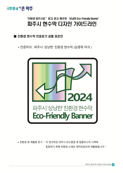현수막 디자인 지침에는 ‘상냥한’ 친환경 현수막 인증표기 공통 표준안이 제시됐다. 표준안을 구체적으로 살펴보면 파주시만의 색깔이 담긴 사업 추진을 위해 사업별 색상 체계를 확립할 것과 바탕색 쓰지 않기, 원색 사용 자제, 친환경 원단 사용 등 환경을 고려한 디자인 사용에 대한 내용이 담겼다.