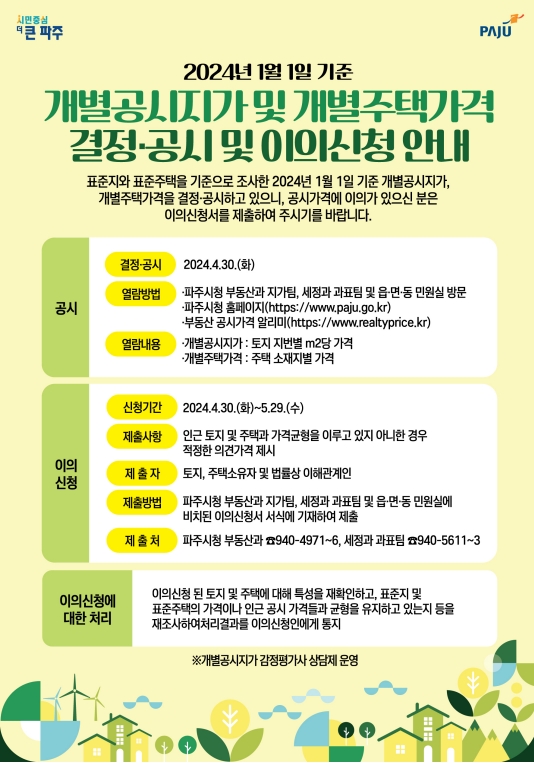 이번에 결정된 개별공시지가는 파주시 누리집(www.paju.go.kr) 또는 부동산공시가격알리미(https://www.realtyprice.kr)에서 확인할 수 있다. 열람 후 이의가 있는 경우, 5월 29일까지 이의신청하면 된다.