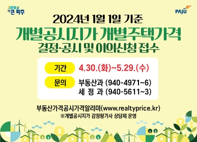 파주시는 2024년 1월 1일 기준 개별주택가격을 4월 30일 결정·공시하고, 5월 29일까지 30일간 이의신청 기간을 운영한다고 밝혔다.