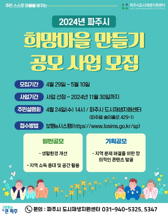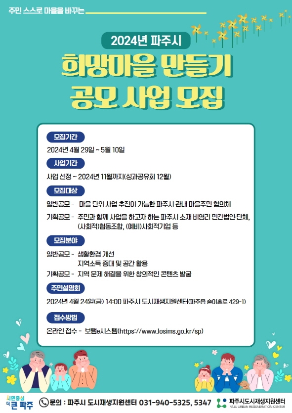 올해 희망마을 만들기 공모사업은 5월 중 1차 서류심사 및 현장 확인, 2차 발표심사를 거쳐 사업을 선정할 계획이며, 기존과는 다르게 일반공모와 기획공모로 사업유형을 나눠 마을주민협의체에만 한정되어 있던 신청 대상을 주민과 함께 사업을 하고자 하는 파주시 소재 비영리 민간법인‧단체, (사회적)협동조합, (예비)사회적기업 등으로까지 확대한다.
