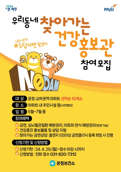 파주 운정보건소는 운정·교하 권역 아파트를 대상으로 금연·건강홍보관을 운영할 아파트를 모집한다.