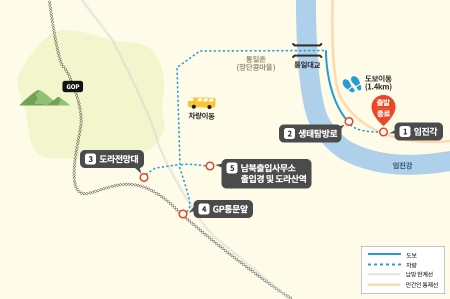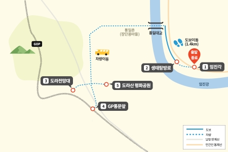 ▲평일 오전과 주말에 이용할 수 있는 1코스는 임진각부터 출발하여 생태탐방로, 도라전망대, 도라산평화공원을 둘러보는 여정