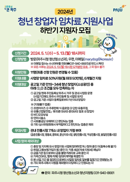 시는 지역 내 청년 창업자의 임차료 부담을 덜어주기 위해 ‘청년 창업자 임차료 지원사업’을 실시하고 있다. 참여 자격은 파주시에 주민등록을 둔 만 19~34세 이하 청년으로, 공고일 기준 사업자 등록일이 1년 이내면서 파주시에 사업장을 운영하는 창업자면 신청 가능하다.
