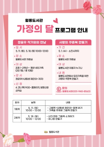 자세한 사항은 월롱도서관 누리집 또는 프로그램 담당자(☎031-940-8563)에게 문의하면 된다.