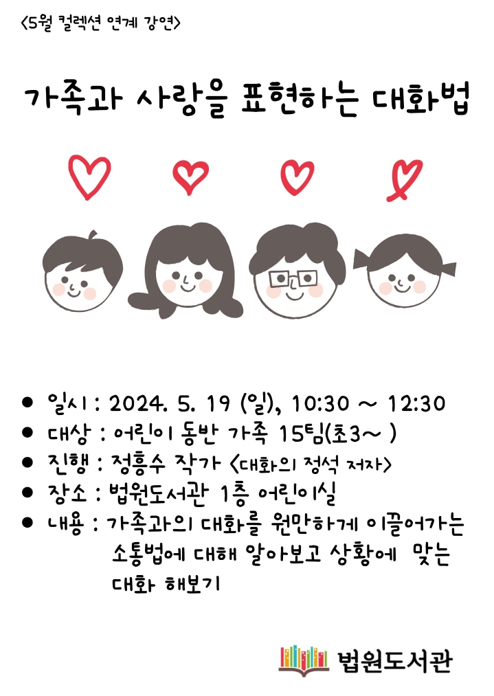 파주시 법원도서관은 오는 19일 ‘가족과 사랑을 표현하는 대화법’이라는 주제로 강연을 진행한다.
