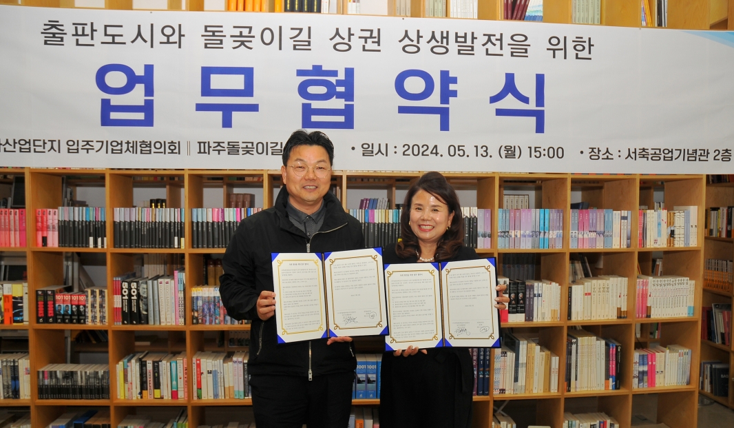 (사)파주출판문화정보국가산업단지 입주기업체협의회가 지난 13일 서축공업기념관에서 파주 돌곶이길 상인회와 ‘출판도시와 돌곶이길 상권 상생 발전을 위한 업무협약’을 체결했다. 이번 협약식에는 입주기업체협의회 정병철 회장, 파주 돌곶이길 상인회 회장이자 ‘솔덕’ 신순덕 대표, 두 기관의 임직원 10여 명이 참석한 가운데 진행됐다.