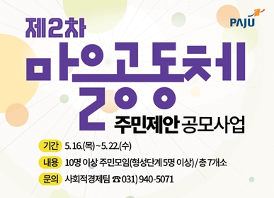 파주시는 ‘2024년 제2차 마을공동체 주민제안 공모사업’에 참여할 마을공동체를 5월 16일부터 22일까지 공개모집한다.