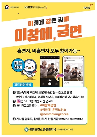 캠페인은 흡연자와 비흡연자 모두 참여 가능하고, 인스타그램에 자신이 담배를 참은 일상 사진과 필수 핵심어 표시(해시태크) #이참에 금연, #이참에_운정보건소, @nosmokingkorea를 입력하면 된다. 캠페인 참여 시 소정의 상품이 지급될 예정이다.