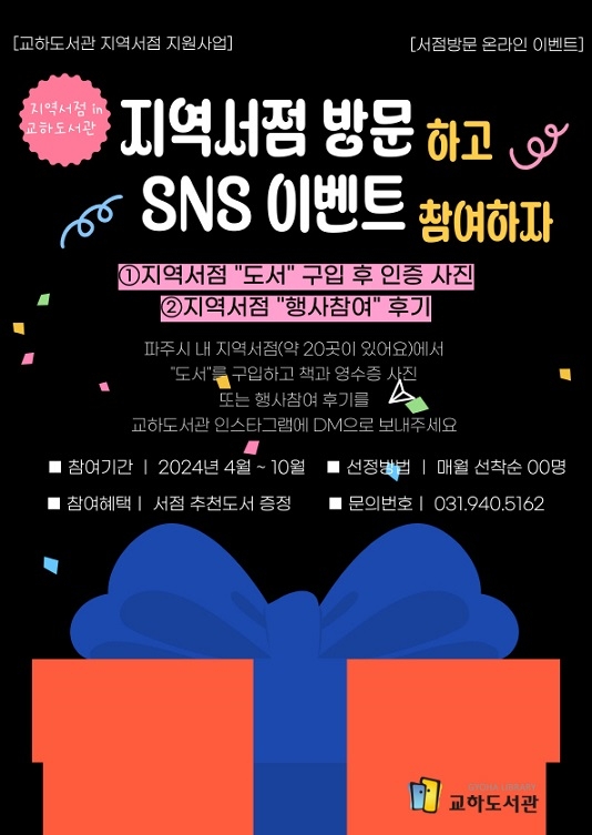 공연, 작가와의 만남 등 행사지원과 서점 홍보를 위한 서점 소개, 추천 도서 전시 등을 비롯하여 지역 서점 이용자들을 위한 행사 참여 후기와 구매한 책의 영수증을 도서관 인스타그램에 쪽지(DM)를 보내면 추첨을 통해 서점 추천 전시 도서를 받을 수 있다.