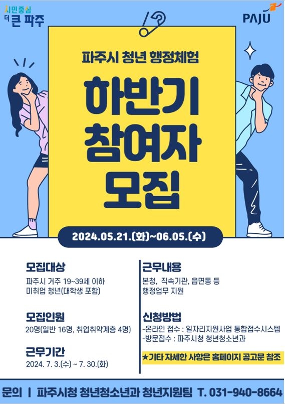 파주시는 오는 21일부터 6월 5일까지 2024년 하반기 청년 행정 체험 참여자 20명을 모집한다고 밝혔다.