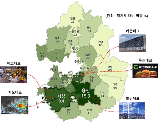 보고서에 따르면, 경기도는 기후테크 산업역량 최우수 지자체로 나타났다. 전국 기후테크 사업체와 종사자수, 매출액 비중이 각각 29.2%, 27.4%, 28.8% 수준으로 전국 17개 시도 중 월등히 높은 비중을 차지했다. 또한 도내 31개 시군의 기술역량과 산업역량을 종합해 분석한 결과, 용인시, 화성시, 성남시가 특히 우수한 것으로 나타났으며 이들 지역을 기후테크 5대 분야로 구분할 때, 용인시는 클린테크, 화성시는 에코테크와 지오테크, 성남시는 카본테크와 푸드테크 분야의 강점이 있는 것으로 나타났다.