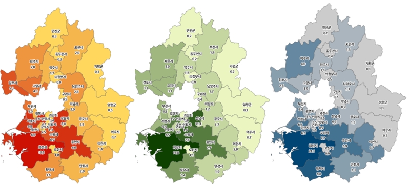 산업역량(%)=(시군별 사업체수+종사자수+매출액)/(경기도 사업체수+종사자수+매출액)*100