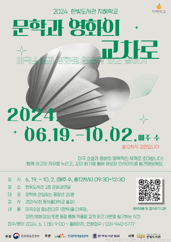 파주시 한빛도서관은 6월 19일부터 10월 2일까지 2024 지혜학교 ‘문학과 영화의 교차로: 미국소설과 영화로 인문학 사고 넓히기’ 강연을 실시한다.