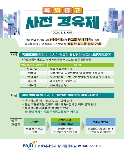 이에, 파주시는 허가나 신고 없이 설치한 광고물 등이 사후 허가나 신고를 거쳐 적법한 광고물로 등록될 수 있도록 하기 위한 양성화 작업을 2022년부터 추진해 왔다. 시는 양성화 작업에 대한 후속 조치로 ‘옥외광고물 사전경유제’를 시행해 시민들의 인식 개선 및 불법광고물을 예방한다는 계획이다.