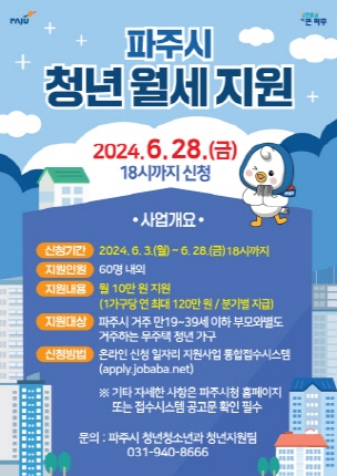 파주시는 고물가로 인한 주거비 부담이 더 커진 청년들의 주거비 부담 완화를 위해 6월 3일부터 28일까지 청년 월세 지원 사업 하반기 참여자 60명을 모집한다.