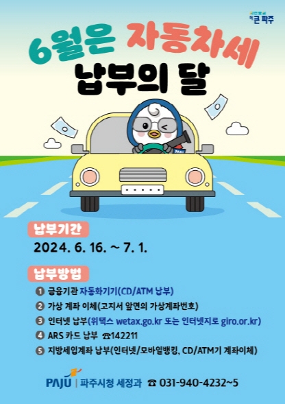 자세한 사항은 파주시청 세정과 자동차세팀(☎031-940-4232~5)으로 문의하면 된다.