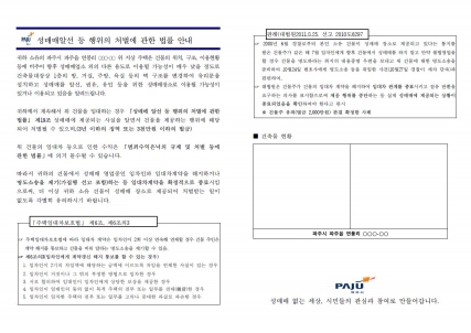 파주시가 성매매집결지 내 건물주와 토지주 40여 명에게 성매매 알선 등으로 처벌받는 피해를 방지할 수 있도록 「성매매 알선 등 행위의 처벌에 관한 법률」 안내문을 발송했다고 밝혔다.