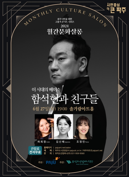 파주시는 고품격 콘서트 ‘월간문화살롱’이 오는 27일 오후 7시, 솔가람아트홀에서 개최한다고 밝혔다. ‘월간문화살롱’은 다양한 주제로 문화예술계 인사들을 초청해 깊이 있는 대화와 공연을 선보이는 자리로 그동안 많은 관객의 사랑을 받아왔다.