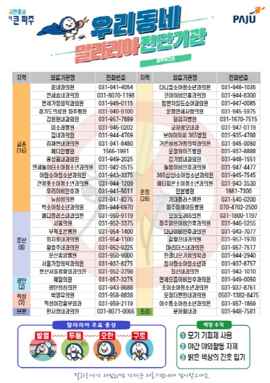 현재 파주시는 의료기관 58곳을 ‘우리동네 말라리아 진단기관’으로 지정해 운영 중이며, 지정된 ‘우리동네 말라리아 진단기관’에 대해서는 파주보건소 누리집에서 확인할 수 있다.