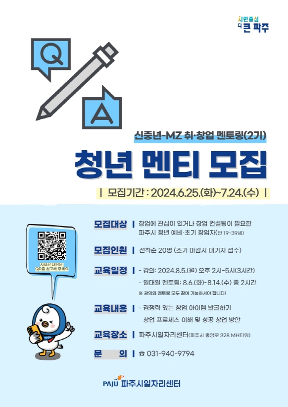 파주시가 6월 25일부터 7월 24일까지 ‘신중년-엠제트(MZ) 취창업 멘토링 프로그램’에 참여할 청년 참여자를 모집한다.