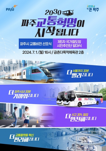 파주시는 7월 1일 오후 4시 금촌다목적체육관 2층 체육관에서 ‘2030 파주시 교통혁명 시작’을 위한 「파주시 교통비전 선포식」 및 「제5차 국가철도망 시민추진단 발대식」을 개최한다.