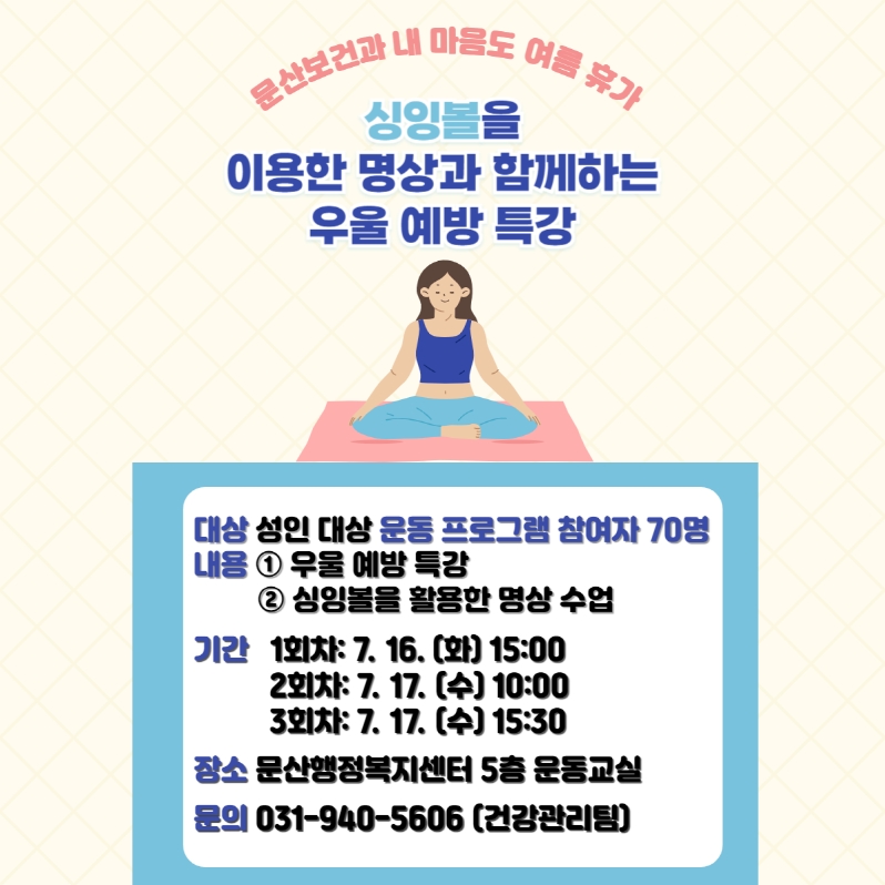 김영미 문산보건과장은 “‘내 마음도 여름 휴가’를 통해 시민들이 우울 증상을 이해하고 스트레스를 관리해 우울감이 개선되길 바란다”라며 “시민들의 몸과 마음 건강에 도움이 될 수 있는 다양한 프로그램을 제공하겠다”라고 말했다.